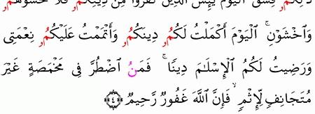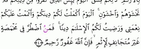 ال ي و م أ ك م ل ت ل ك م د ين ك م و أ ت م م ت ع ل ي ك م ن ع م ت ي و ر ض يت ل ك م ال إ س ل ام د ين ا