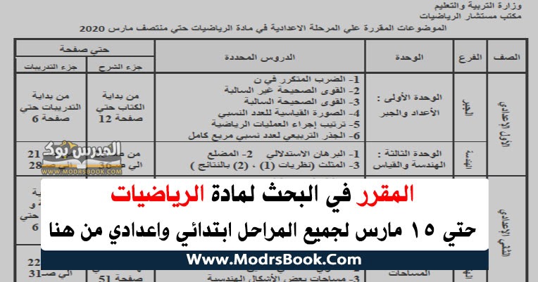 المقرر في البحث مادة الرياضيات ابتدائي واعدادي حتي 15 مارس 2020