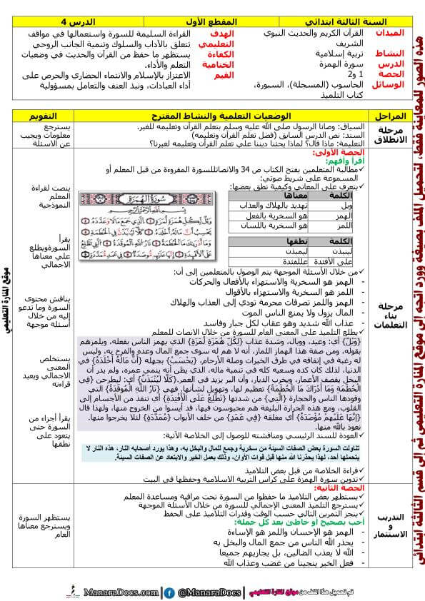 مذكرات السنة الثالثة 3 ابتدائي في التربية الاسلامية المقطع الاول درس سورة الهمزة وورد Word