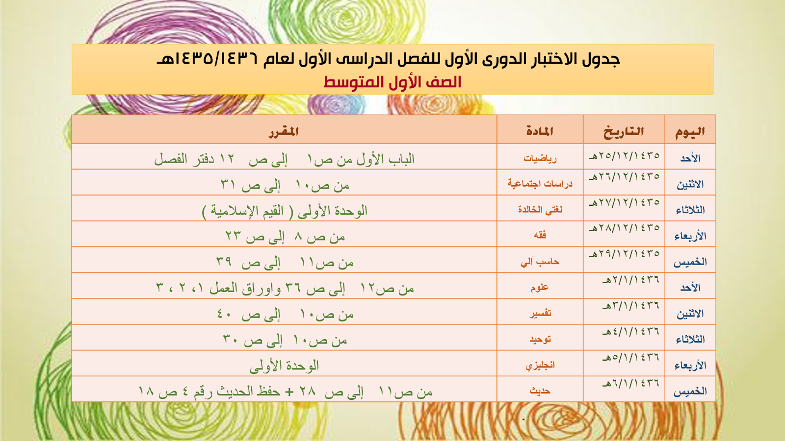 المتوسط بنات الريان جدول الاختبار الدوري الأول للصف الأول المتوسط