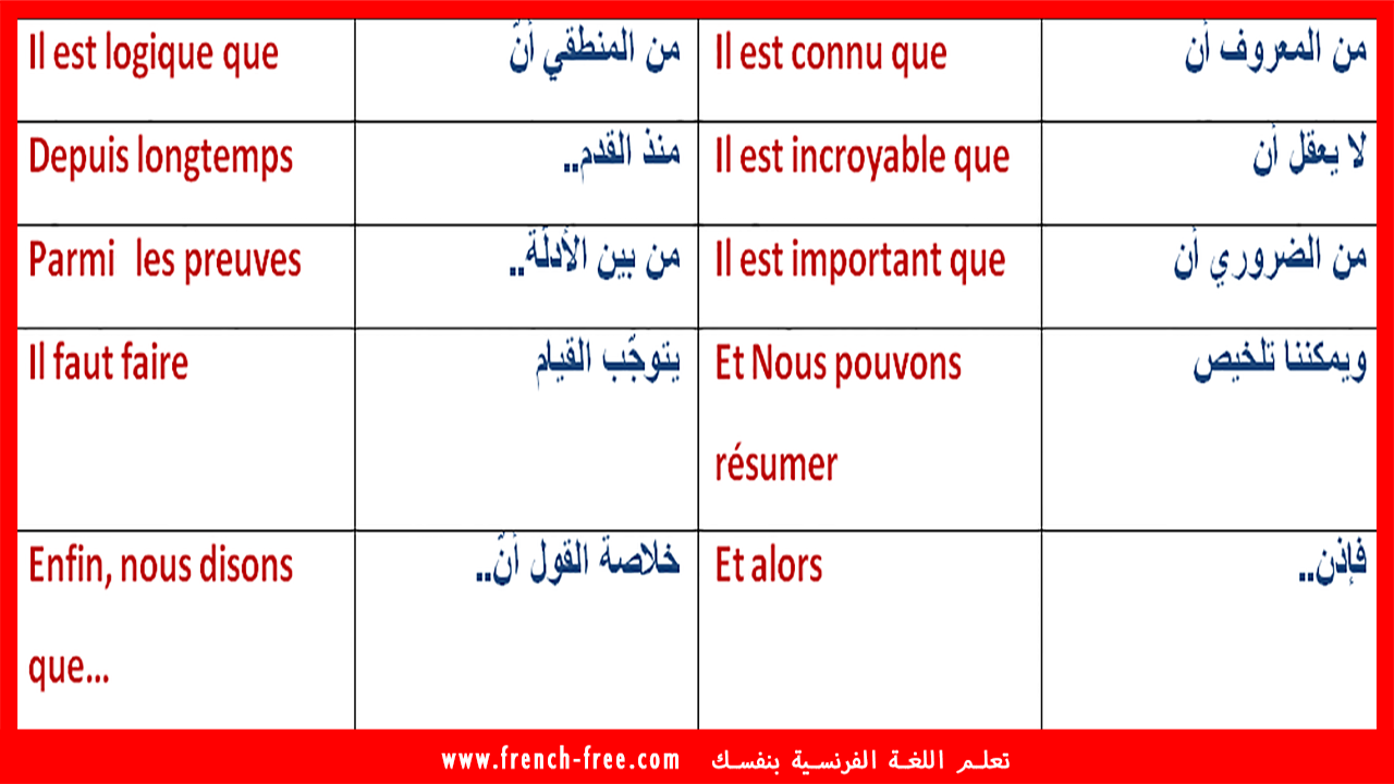 جمل تستعمل في كتابة الإنشاءات وتحرير النصوص باللغة الفرنسية مترجمة للعربية المجموعة 1 تحميل الدرس كاملا