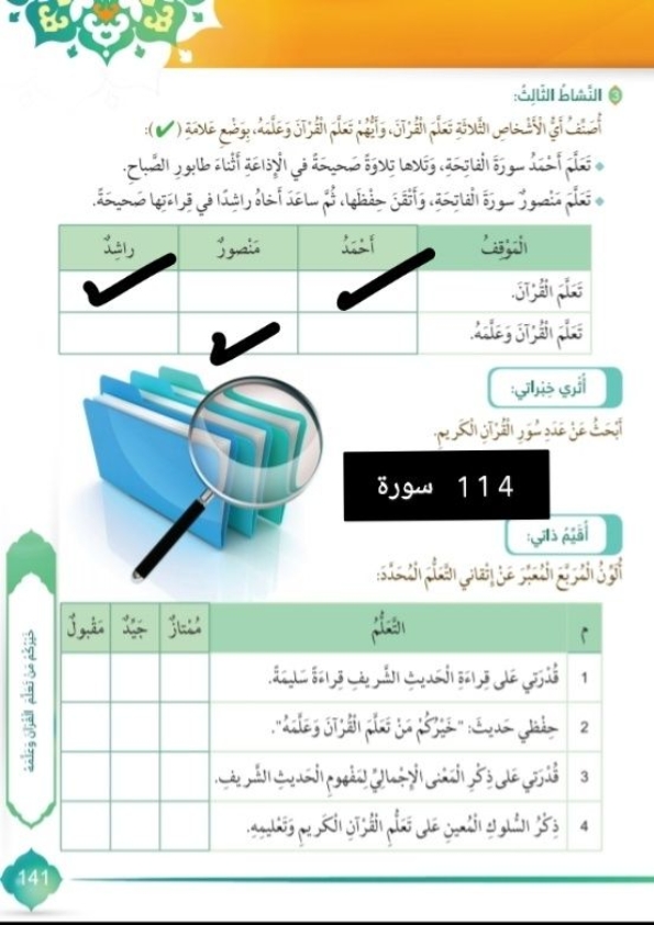 التربية الإسلامية درس خيركم من تعلم القرآن وعلمه للصف الأول مع الإجابات ملفاتي