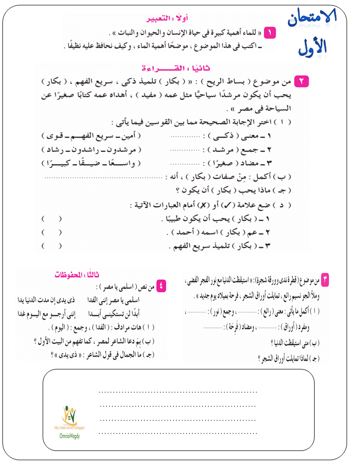 Omniawagdy للطباعة وبدون تحميل امتحانات سلاح التلميذ فى اللغة العربية للصف الرابع الابتدائى الترم الأول