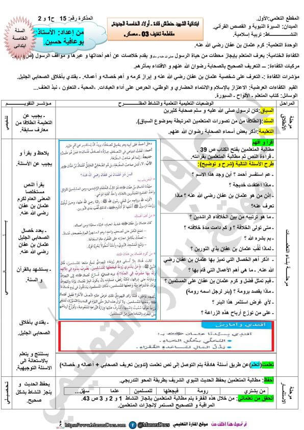 مذكرات السنة الخامسة ابتدائي في التربية الاسلامية المقطع الاول درس كرم عثمان بن عفان Onec Bem Bac