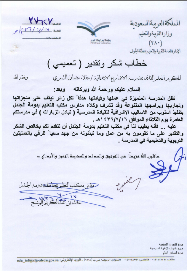 خطابات الشكر والتقدير خطاب شكر للمعلم القائد عقلا عثمان الشمري تبادل الزيارات